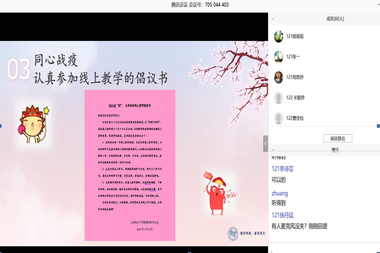通过首日教育和主题班会,同学们感受到中国英雄、中国力量、中国速度,同学们一致认为,众志成城,共克时艰,我们一定能够夺取这场疫情防控阻击战的胜利,在抗击疫情这场大考中,交出彰显青春使命和担当的满意答卷。同学们也纷纷表示响应倡议,认真参加线上教学,从自身做起,共建优良学风,以笔为戈,以纸为戎,在行动践行承诺,展现担当。