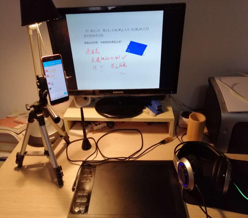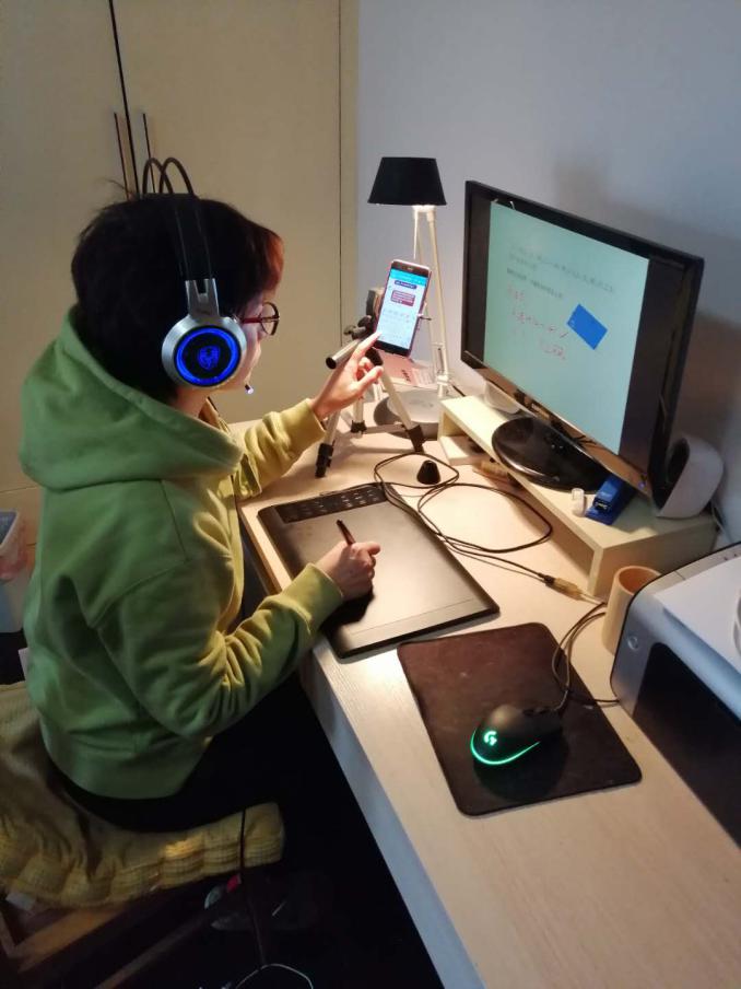 除了摸透平台的各项功能,上课前,宋老师还练习手写板使用,设计修改PPT。宋老师觉得线上授课和线下授课不同,线上授课前,要求学生们必须观看过平台引用的相应的教学视频。直播时,主要是复习巩固知识点,所以以前线下用的PPT都需要推到重来。除了内容大改之外,为了吸引同学们的注意力,还需要设置大量的互动环节,这都要设计到PPT上。上课时,宋老师有个习惯,喜欢对一些重要的知识点圈圈画画,加批注,提醒学生注意;答疑时,文字和语音有时候解释不清楚时,喜欢边写边说,所以宋老师准备了手写板,这样可以让学生有和线下上课一样的体验。用手写板写字,一开始会不习惯,宋老师PPT做累了,就练习用手写板写字,现在也写得有模有样了。