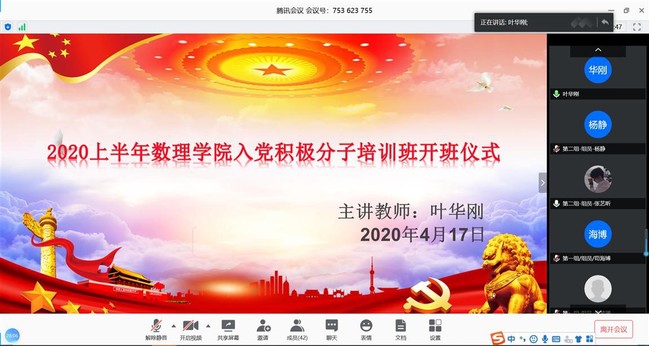 为学习贯彻习近平新时代中国特色社会主义思想,不断提高入党积极分子的思想政治素质和政治理论水平,进一步提高入党积极分子对党的认识,明确入党目的,端正入党动机,坚定理想信念,树牢“四个意识”,增强“四个自信”,我院开办2020年上半年积极分子培训班。4月17日,2020年上半年BB贝博艾弗森官方网站入党积极分子培训班开班仪式及开班第一讲在线上腾讯会议举行。学院党委副书记叶华刚、院专职组织员吕莹以及全体学员参加了本次线上会议。