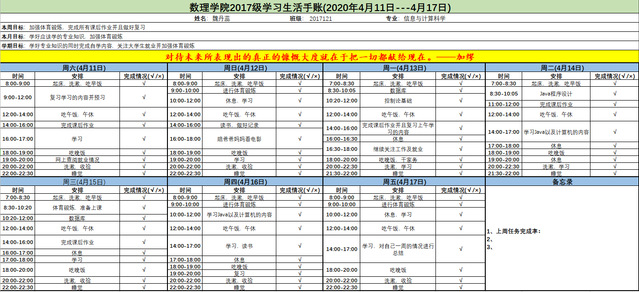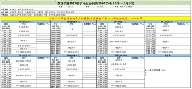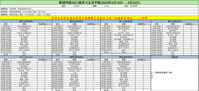 2017231班的李齐昕是第一次使用手账,对于手账的效果深有感触:“凡事预则立,不预则废。由于疫情原因,同学们长时间待在家里,此时一份合理的计划清单就显得尤为重要。在我们辅导员陈毓老师的倡导下,我每星期都列了详细的计划表,精确到分,并严格按照这张表执行计划。尽管在实际实施的过程中,或多或少会有一些意料之外,有一小部分时间段的计划没有完成,但是我仍感觉这份计划表大大提高了我的学习效率。接下来我会继续按照我的计划表行动,一步步达成自己设定的目标。”