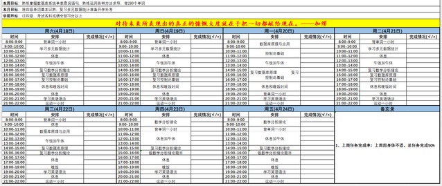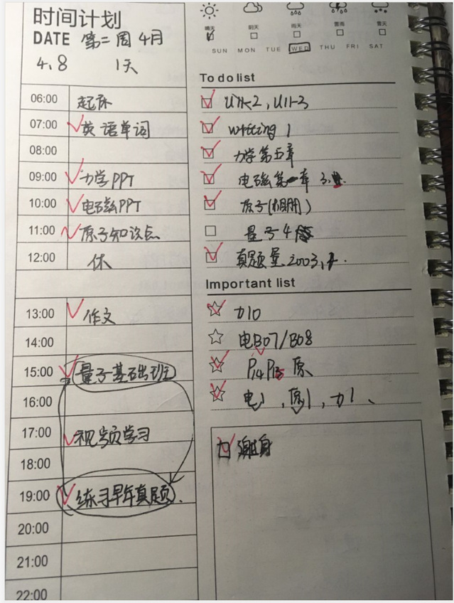 2017232班的彭晓梅同学每天手写手账,并与一起考研的朋友们组成打卡小组,用倒计时和相互鼓励提醒自己梦想彼岸的方向与距离。她说:“最重要的是要坚持,唯有长久的坚持方能发现自己的成长和改变。”让自律成就自己,内容充实、安排得当的一周手账就是数理学子们为梦想奋斗的最好证明!
