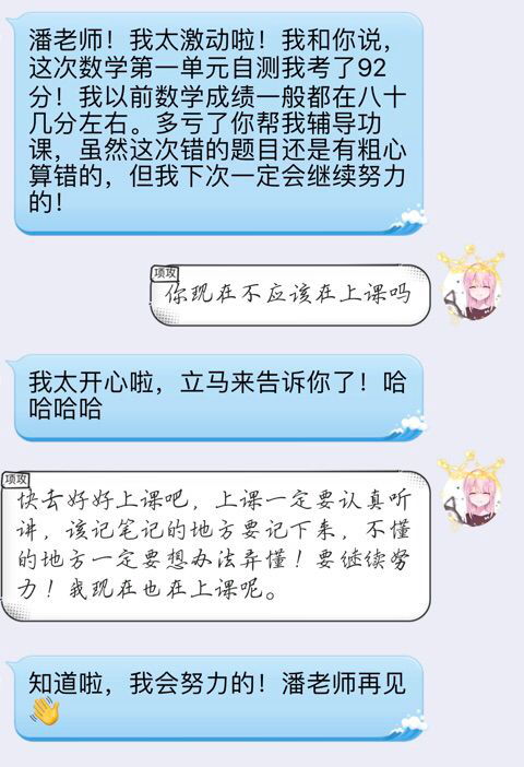 每周三次的线上数学辅导随着上海市空中课堂开课告一段落,而潘斌海与小王、小徐的师生情还在延续。小王所就读的学校测评成绩一出,激动不已的他便第一时间将成绩进步的好消息告诉这位疫情期间的知心大哥哥与小老师。