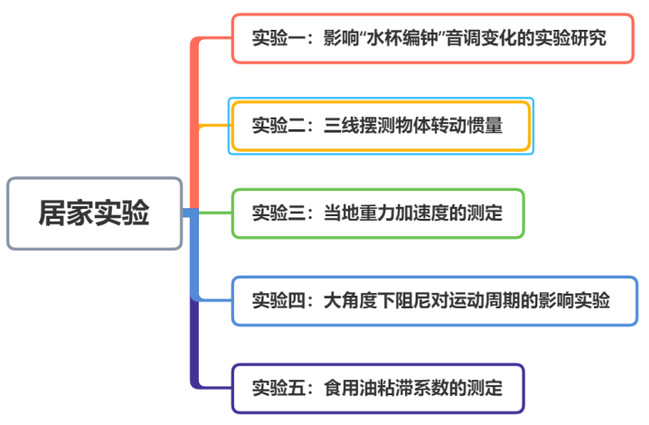 实验中心设计的居家实验有“影响‘水杯编钟’音调变化的实验研究”“三线摆测物体转动惯量”“当地重力加速度的测定”等6个实验项目,学生可根据自己喜好进行自由选择。同时,这些实验取材均可来自日常生活中的常见物品,装置搭建也较为简单,深得学生喜爱。