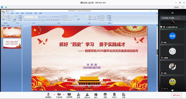 在即将迎来中国共产党建党99周年前夕,6月24日,BB贝博艾弗森官方网站在线上腾讯会议开展了毕业班学生党员离校教育暨党员廉洁诚信专题教育。学院党委副书记叶华刚、专职组织员吕莹、信物本科生低年级党支部书记刘紫薇、毕业班辅导员康鸿轩及全体毕业生党员参加会议。