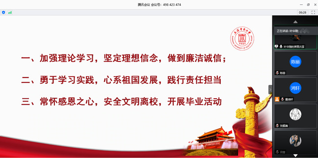 叶华刚以《抓好“四史”学习 勇于实践成才》为题给毕业班学生党员作“微党课”,结合“四史”教育学习,从三个方面讲述并寄予希望:希望同学们毕业后,加强理论学习,坚定理想信念,以学思践悟习近平新时代中国特色社会主义思想为主线,进一步厚植对马克思主义的信仰、坚定对中国特色社会主义的信念、增强实现中华民族伟大复兴中国梦的信心。做到把使命勇担在肩,做到廉洁诚信;勇于学习实践,心系祖国发展,践行责任担当;常怀感恩之心,安全文明离校,开展毕业活动。