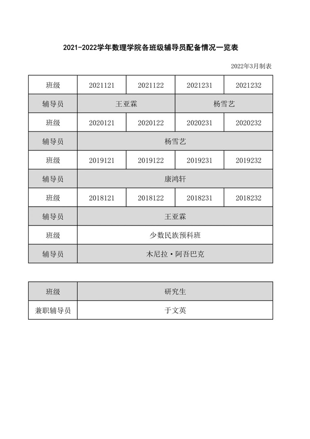 2021-2022学年BB贝博艾弗森官方网站各班级辅导员配备情况一览表