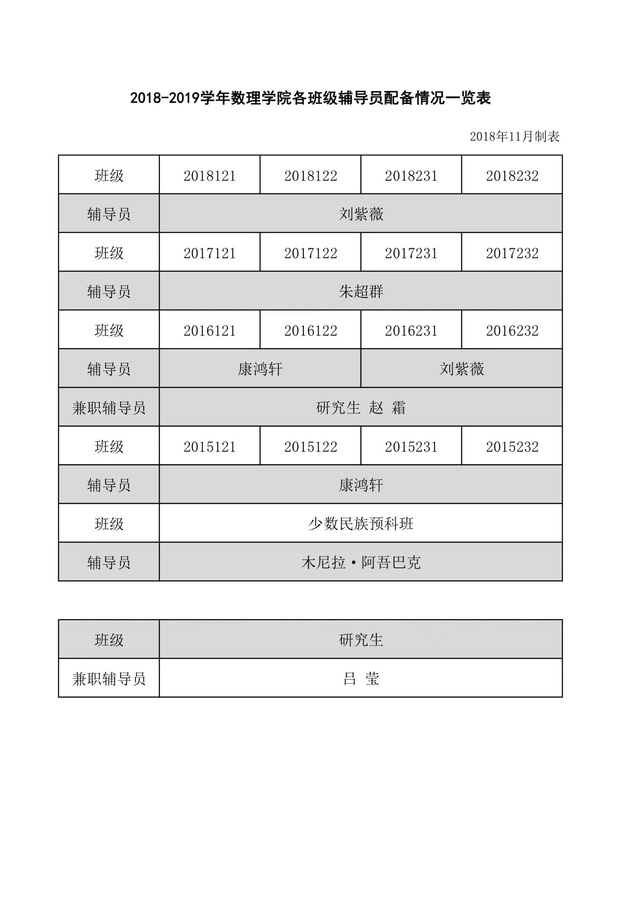 2018-2019学年BB贝博艾弗森官方网站各班级辅导员配备情况一览表