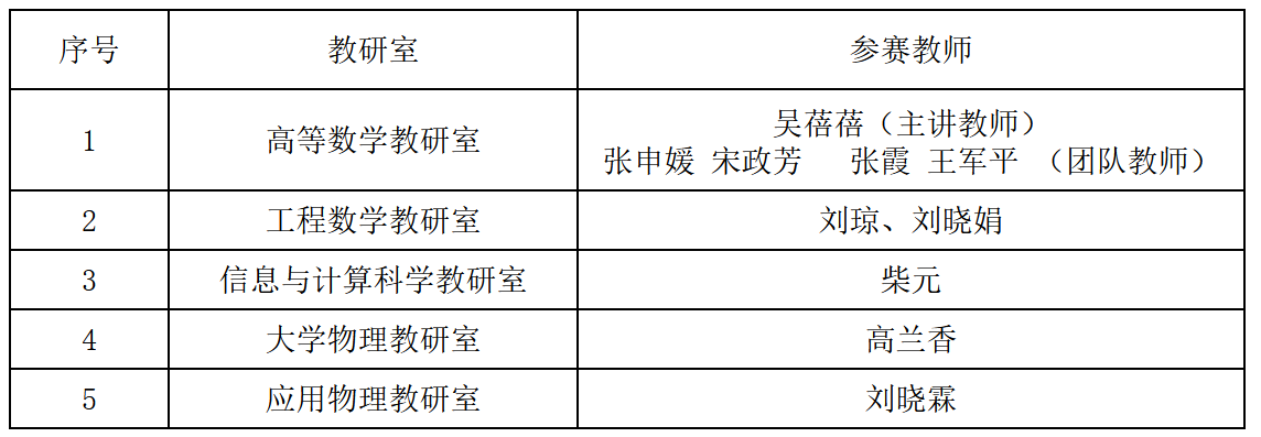 经各教研室内部评选,推荐至学院的课程教师(含团队)见下表。