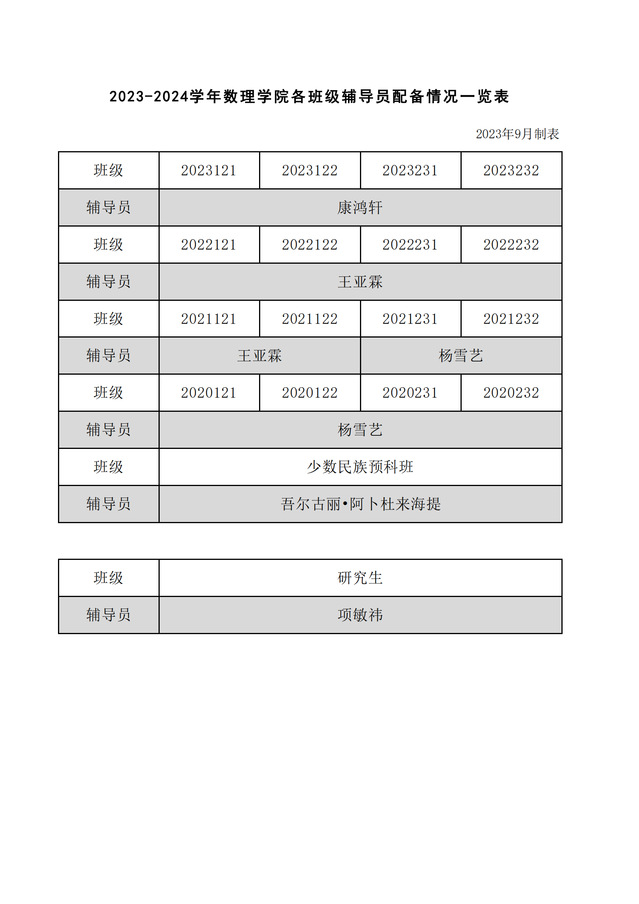 2023-2024学年BB贝博艾弗森官方网站各班级辅导员配备情况一览表