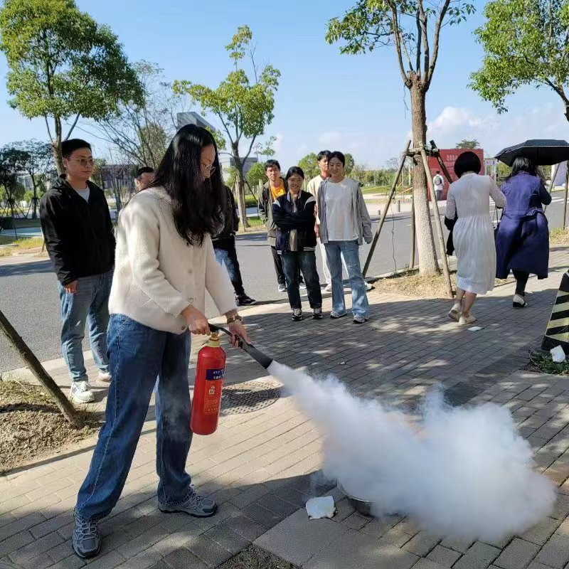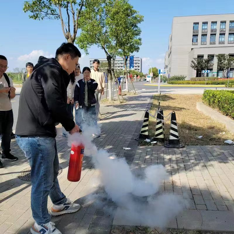 演练场景2:某实验室同学在做加热实验时,由于温度过高,不小心发生了小面积着火,学生开展自救行动,将一楼楼道中的灭火器将火扑灭。同组学生第一时间联系到自己的导师,导师立即赶到现场进行处理。同时,组织了学生在楼外侧进行灭火器的使用方法培训,加强学生应急处理的能力。